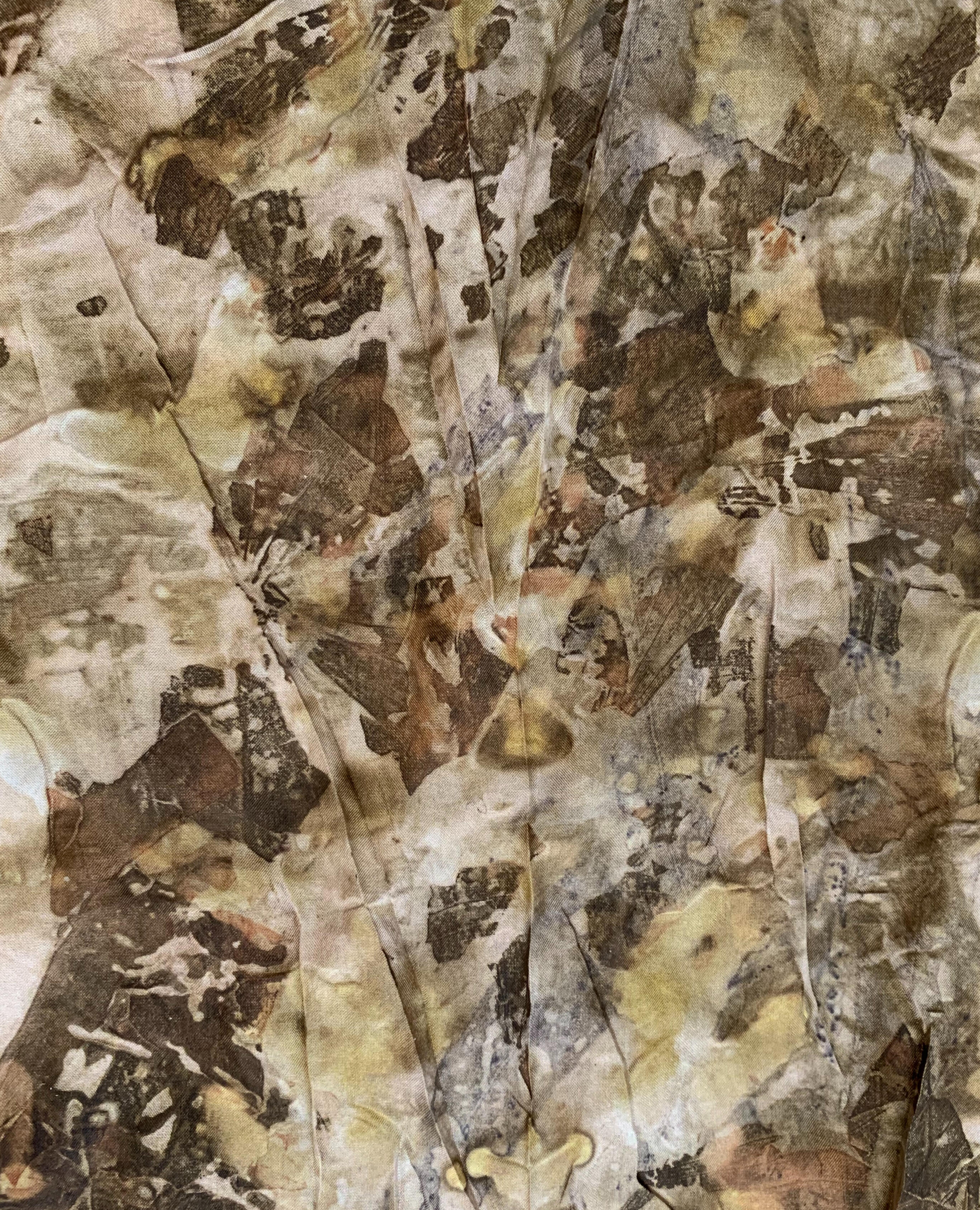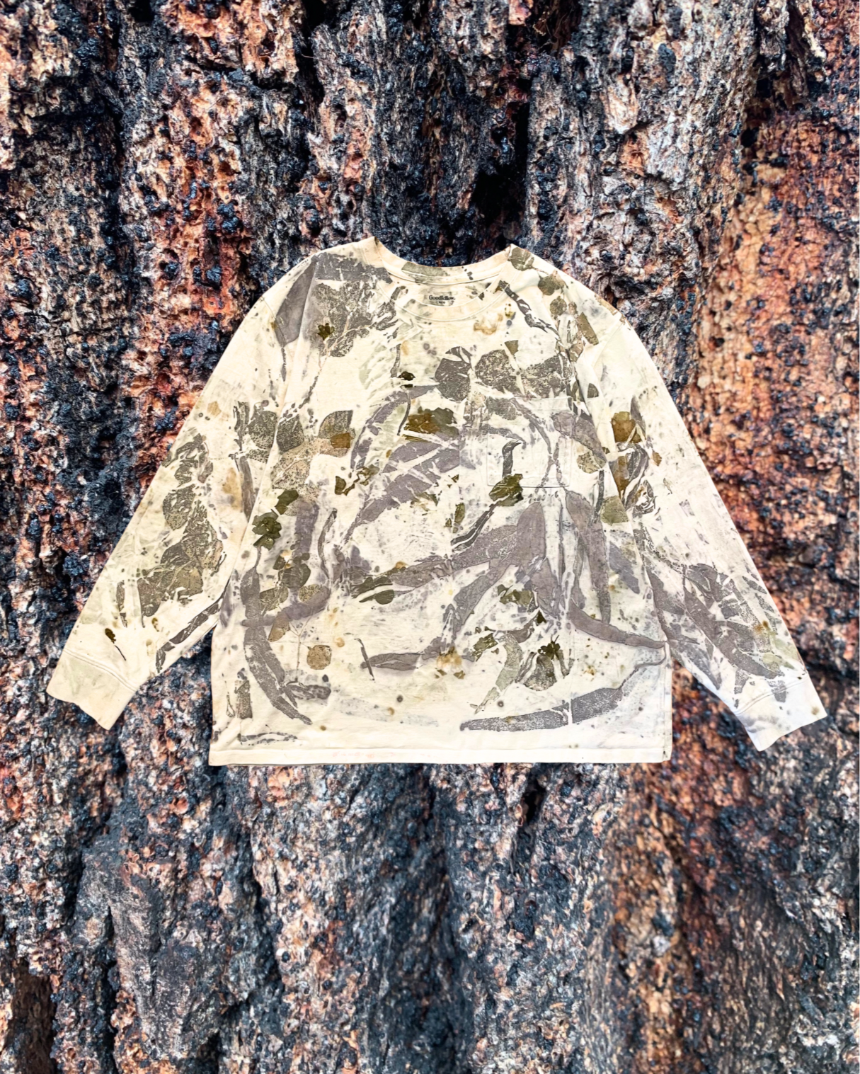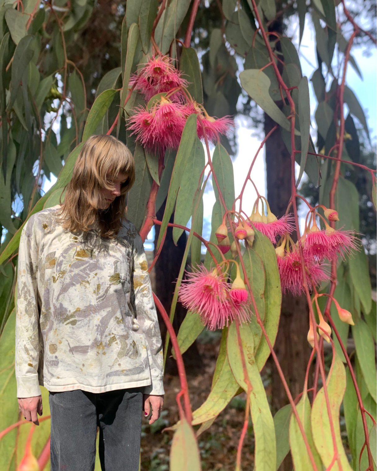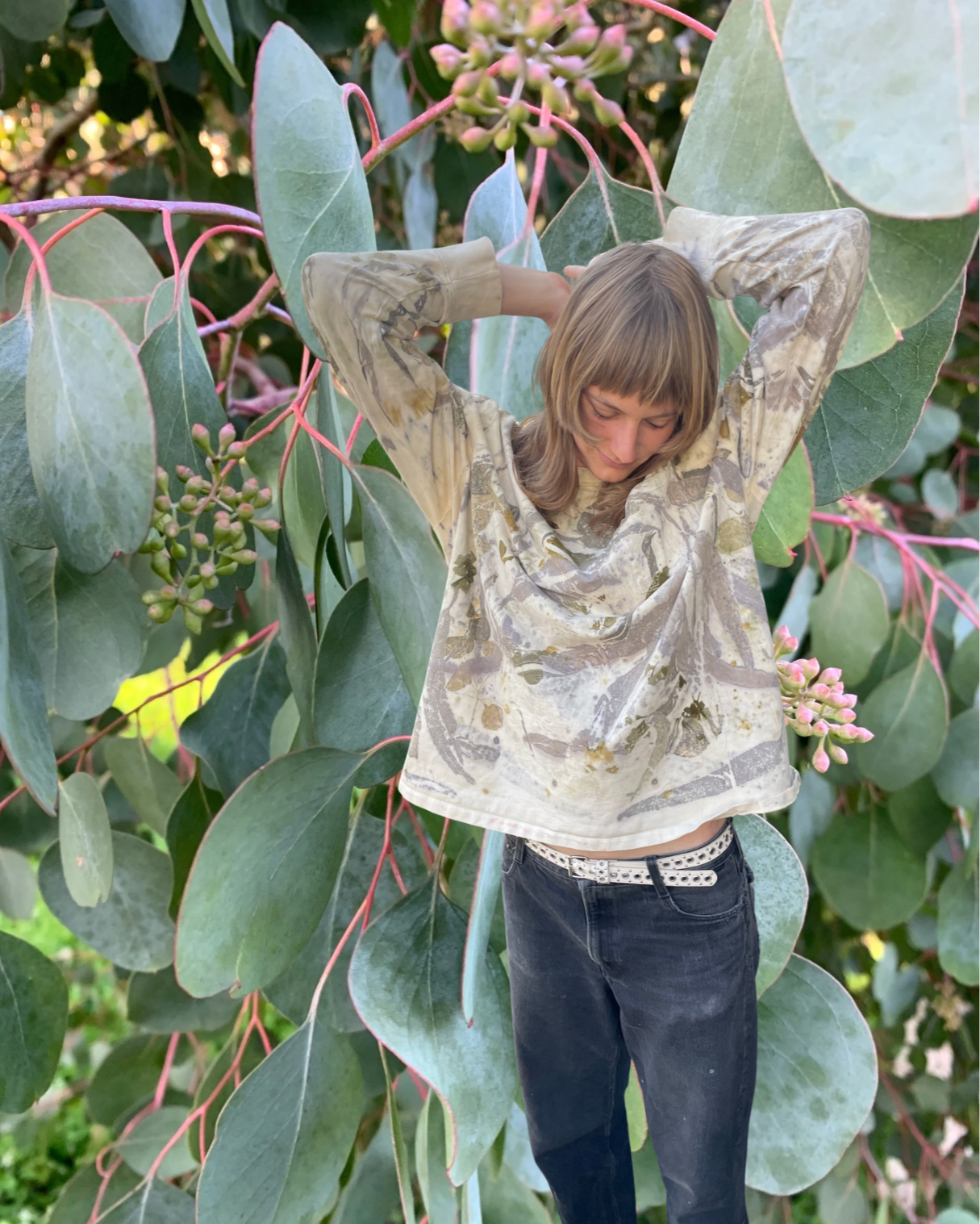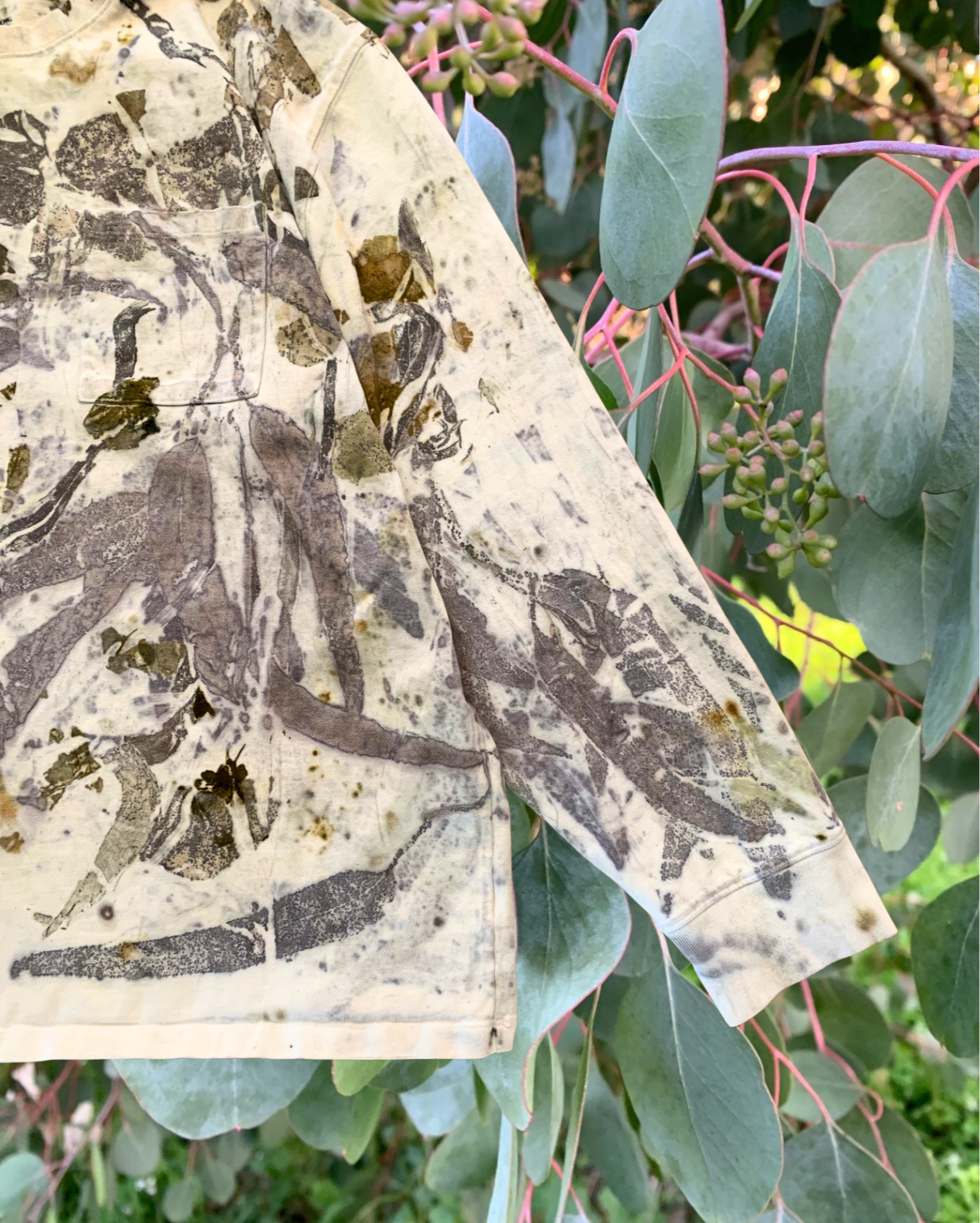 DARIA MAKES ECO PRINT CAMO FROM INVASIVE BAY AREA PLANTS (BLACKBERRY, SOURGRASS AND EUCALYPTUS) + UPCYCLED CLOTHING.